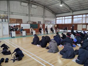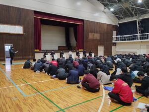 今回の対象は2年生で、進学希望者は格技場、就職希望者は体育館に集まり、先輩の話を聴きました。高校最後の考査を終えたばかりの3年生が、後輩に向けて、「いつ頃企業や大学等を決めたのか」、「合格に向けてどのような準備をいつ頃からしてきたのか」、そして最後に「後輩に伝えたいこと」を熱く語ってくれました。寒い日で防寒具を着用しての学習会でしたが、2年生はメモをしっかり取りながら、真剣に先輩の言葉に聴き入っていました。