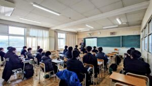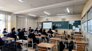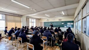 3月12日(木)1年生全体で、外部から講師を招いての進路に関わる学習会を行いました。