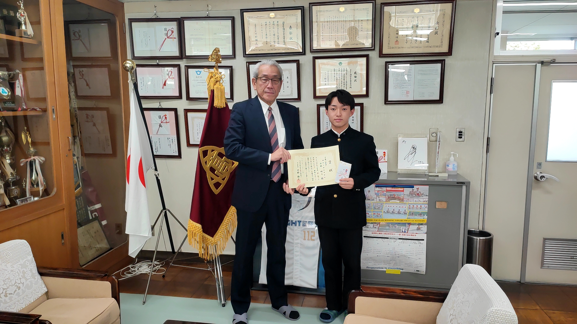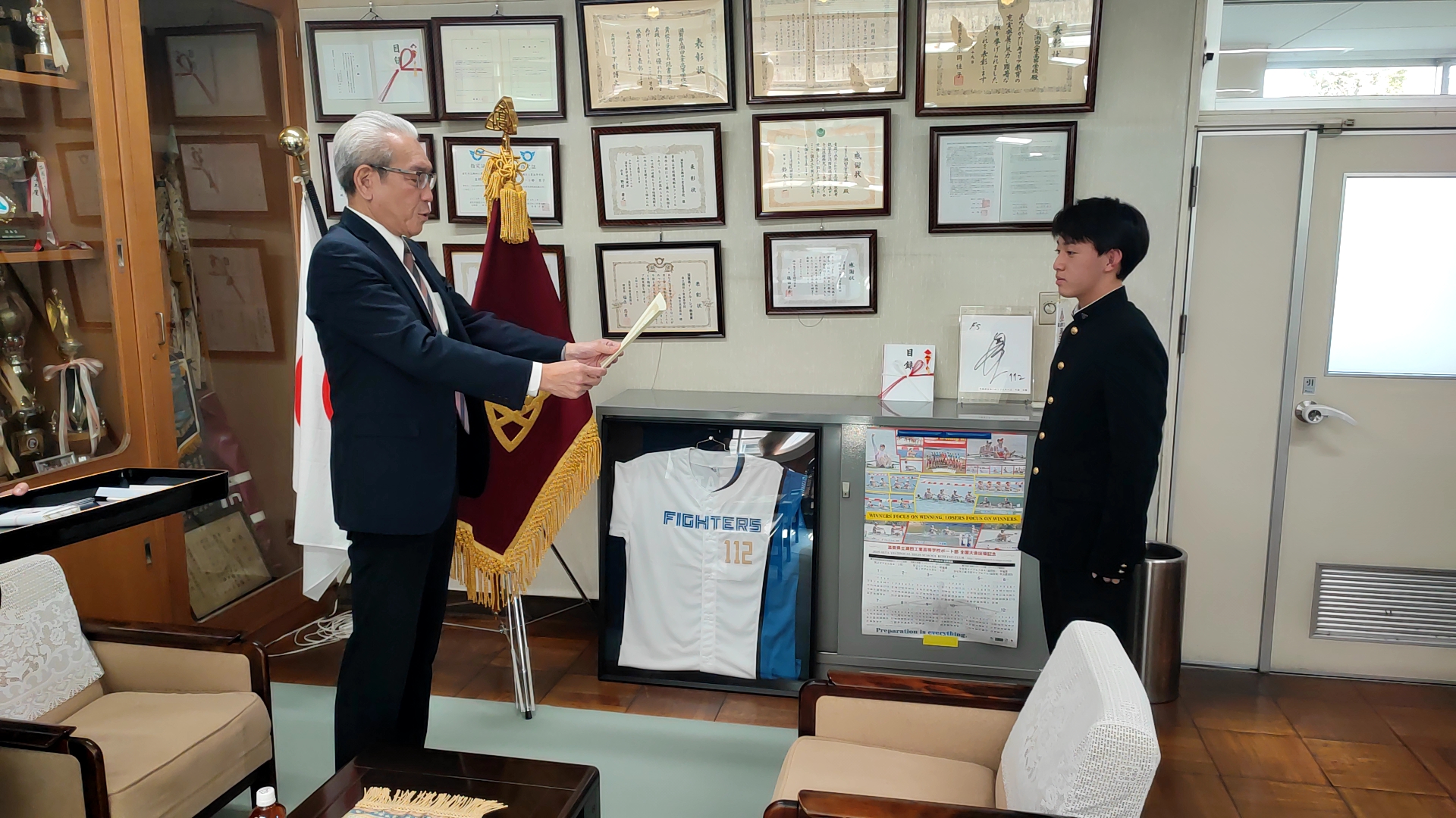 本校校長室にて、大津税務署長 中野様より直接表彰していただきました。